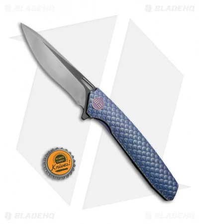 The We Knife Co. 604M offers a long elegant design with a sleek recurve blade in a two-tone finish. Black flats and satin finished grinds add to the tactical appeal of the blade. The blue anodized titanium handle comes with a scaled texture that provides a utilitarian grip as well as a collectible custom appearance. Purple anodized titanium clip and hardware finish off the stellar design.