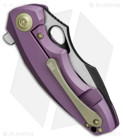 The 605A represents We Knife Co’s most compact EDC flipper to date. With a 3″ blade and a sturdy titanium handle, the 605 is built strong enough to handle any cutting chore, big or small. The frame lock handle features a reinforced lock bar and an ergonomically contoured grip. It has a modified drop point blade with a choil and thumb rest for choking up your grip for more leverage. A blade flipper and an ample thumb hole provide diverse deployment options. This 605A model has a purple anodized handle with bronzed hardware and a two-tone finished blade.