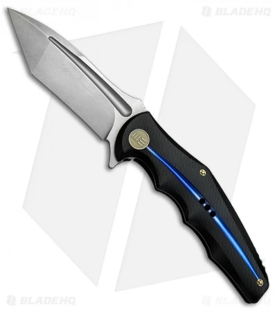 The WE Knife Co. 608G is a reliable flipper made with premium materials and lightweight, ergonomic construction. Its reinforced tanto style blade features jimping on the thumb ramp and flipper for added grip and control. The 608G boasts a ceramic ball bearing pivot for unbelievably responsive flipping action. This model has a black titanium handle with a blue accent and bronzed hardware. It is equipped with a stonewash finished blade.