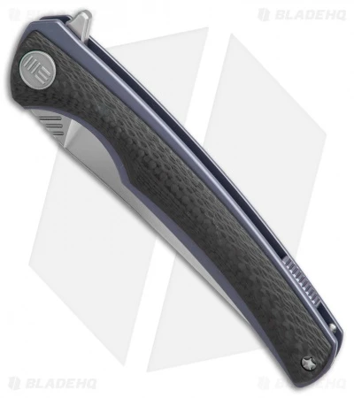 The 704CF-B folding knife from WE Knife Co. is equipped with carbon fiber scales over blue anodized titanium liners. Its lightweight handle is paired with a hand rubbed satin finished Bohler M390 blade with a slight upswept tip. The addition of a ball bearing pivot offers smooth flipping action for responsive and reliable one-handed blade deployment. This pocket-friendly design comes fitted with a blue anodized tip-up titanium pocket clip.