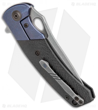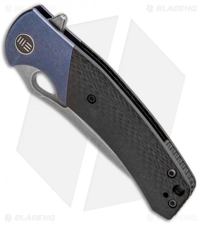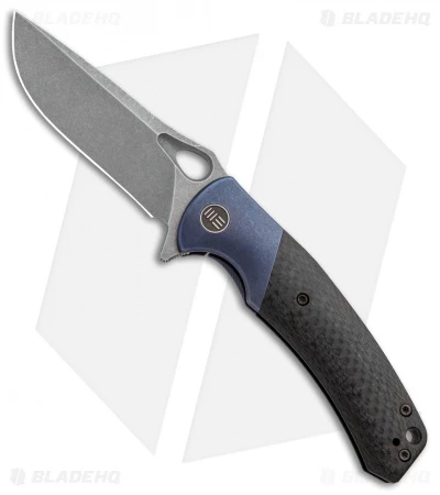 This model of the WE Knife Co. Bishop features a blue anodized handle with carbon fiber overlays and a stonewashed blade.