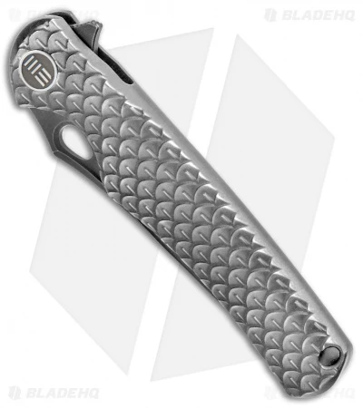Pick up a rock solid integral folding knife design with the Drakon from WE Knife co. This Drakon model is built with a gray titanium handle and a black stonewashed blade. The blade glides open on a ceramic ball bearing and locks up solid with a titanium frame lock. Milled texturing on the handle provides a secure grip in difficult conditions. A titanium pocket clip rounds out the impressive Drakon design.