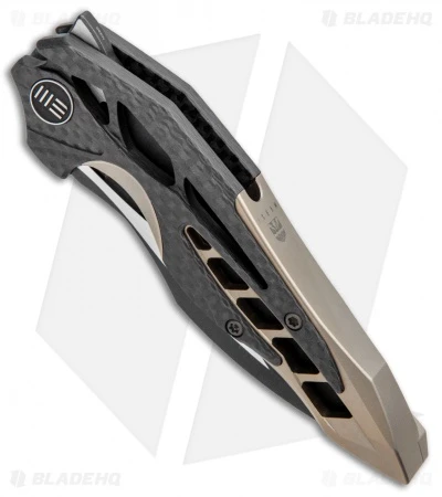 This model of the WE Knife Co. Arrakis sports a champagne anodized titanium and carbon fiber handle with a two-tone M390 blade.