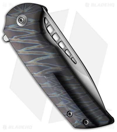 - Flame-anodized tiger stripe titanium handle scales.