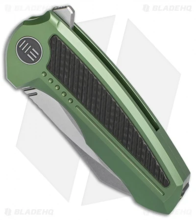 This Valiant 717F model features a green anodized titanium handle with carbon fiber inlays and a modified clip point blade with stonewashed flats and satin finished grinds.