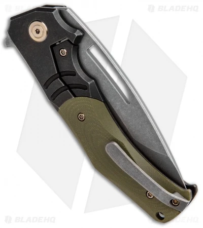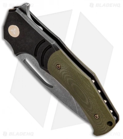 This model of the WE JIXX features a black titanium handle with an OD green G-10 overlay and a stonewashed blade.