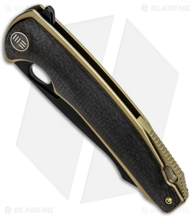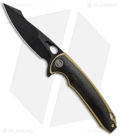 The Yucha from WE Knife Co. offers a sleek titanium build for stylish gentlemen’s carry. This Yucha model is outfitted with a black stonewashed harpoon style blade and a gold anodized titanium frame with carbon fiber scales. The flipper blade glides open effortlessly on WE’s ceramic ball bearing pivot. Thumb rest jimping and an index choil provide a secure grip for any difficult cutting task. Class up your everyday carry rotation with the WE Knife Co. Yucha.